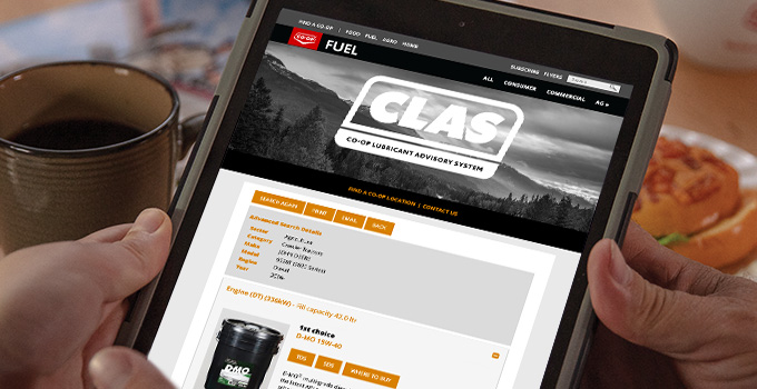 Co-op Lubricant Advisory System (CLAS) is the latest tool to provide Co-op Premium Lubricant oil recommendations based on the make and model of your vehicle or equipment. CLAS is accessible through your mobile or desktop device. It has a wide-ranging database that includes the latest information on engine oils, transmissions, differentials, hydraulics, gear oils, power steering and brake fluids, coolants and greases. CLAS removes any customer service barriers that may exist for Co-op customers to get lubricant recommendations and allows Fuel Team members to fully understand and provide knowledgeable advice for your overall operational needs.