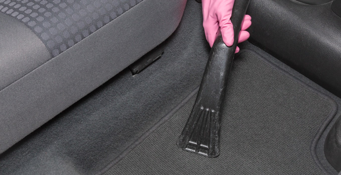 3. Carpet: Use a scrub brush to work dirt to the surface, increasing the effectiveness of vacuuming. Move the seat completely to the front or back to expose all areas while cleaning. Use foaming carpet shampoo for tough stains and rinse rubber floor mats outside using a garden hose.